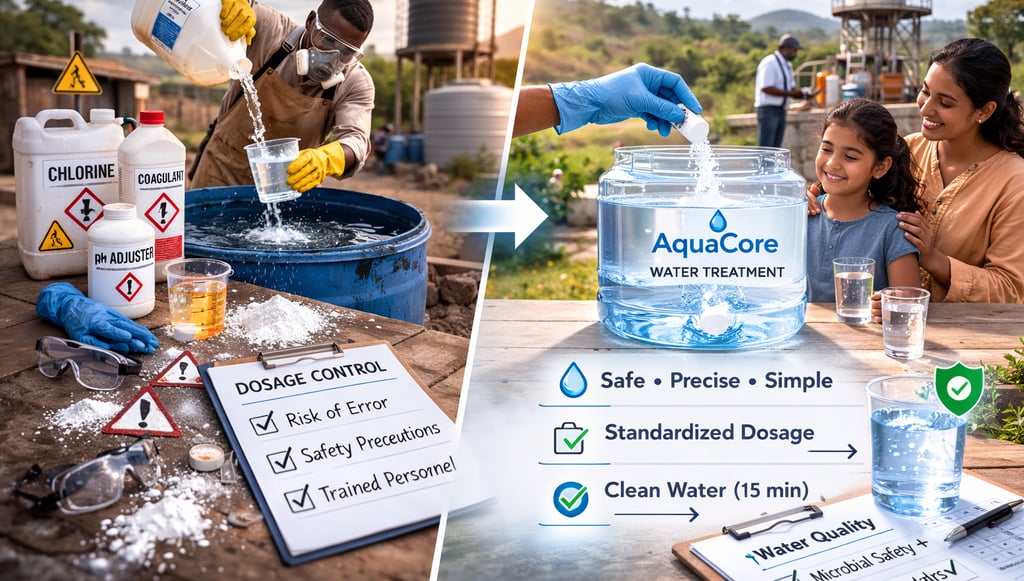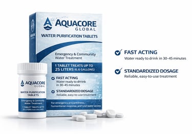 AquaCore's tablet-based treatment technology enables controlled water disinfection through a simple dosage model designed for institutional programs, humanitarian deployment, and infrastructure-limited environments.
